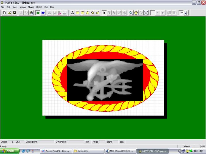 The scan of the Navy Seal pin was imported into 3d Engrave. The shape of the ring top and rope border designed then positioned. A relief of each component was then determined.