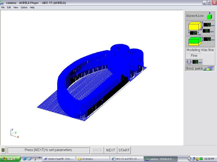| Modela Player is the program that you will determine the size of your design, direction of cutting, the depth of your cutting and the end mill that you will be using. There are predetermined cutting parameters for different materials that you can cut. Once you are through these simple steps just click the tool path button and the tool path will be automatically calculated. Preview your milling in Virtual Modela. |